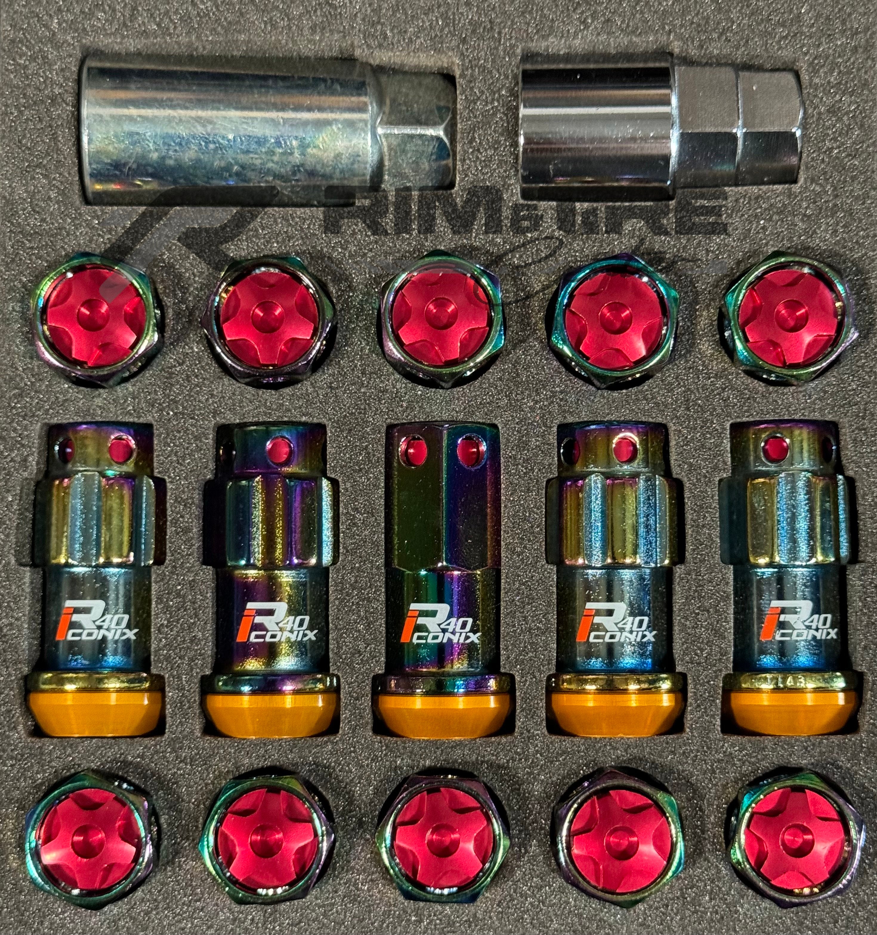 Project Kics Lug Nut & Lock Set R40 ICONIX M14 14x1.5 20PC Neo Chrome w/ Red Caps WRIA14NR
